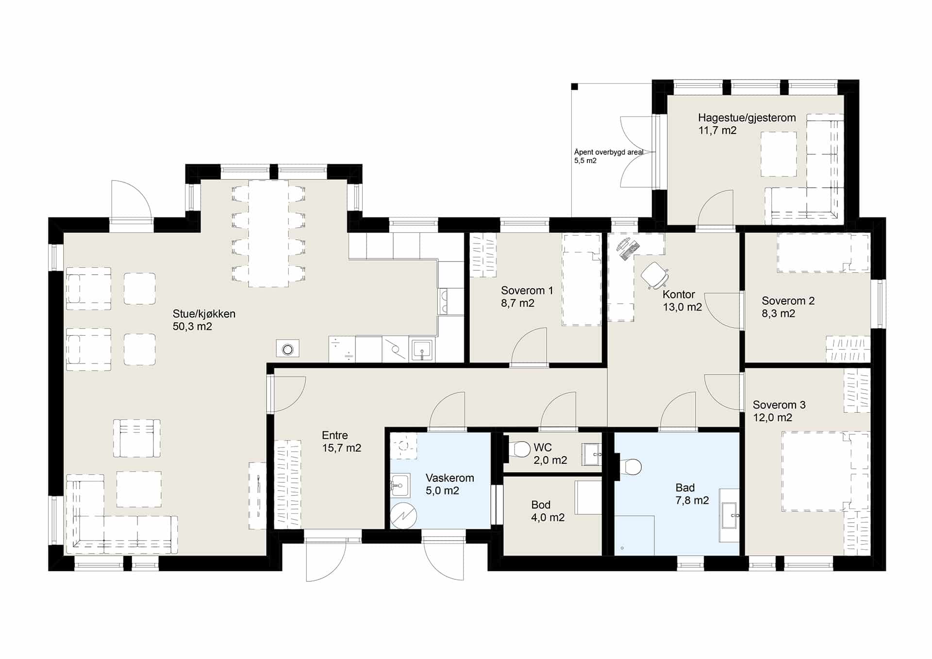 Ønsker du deg et stort oppholdsrom med flere ulike oppholdssoner, trimrom, kontor eller bibliotek, bad, tre soverom, vaskerom og bod? Gimle har alt dette – på ett plan. Et inntrekt inngangsparti gir ly for inngangsdøra og en separat dør til vaskerommet. Oppholdsrommene ligger i direkte tilknytning til entreen. Fra stua er det doble balkongdører ut til hagen. Et frambygg gir ekstra plass til spisestuen. Fra entreen er det videre forbindelse til tre soverom, bad, toalett, kontor og ikke minst et bonusrom. Dette rommet kan bli det du ønsker; bibliotek, tv-stue, soverom, treningsrom – og med egen utgang til uteplassen. Med en lun, dels overbygd uteplass ligger alt til rette for å få maksimalt ut av sommerdagene. Mange unge som eldre – ikke minst barnefamilier – foretrekker å bo på ett plan.